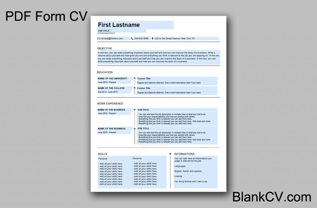 This One-Page CV is a simple PDF form that you fill the blank boxes.